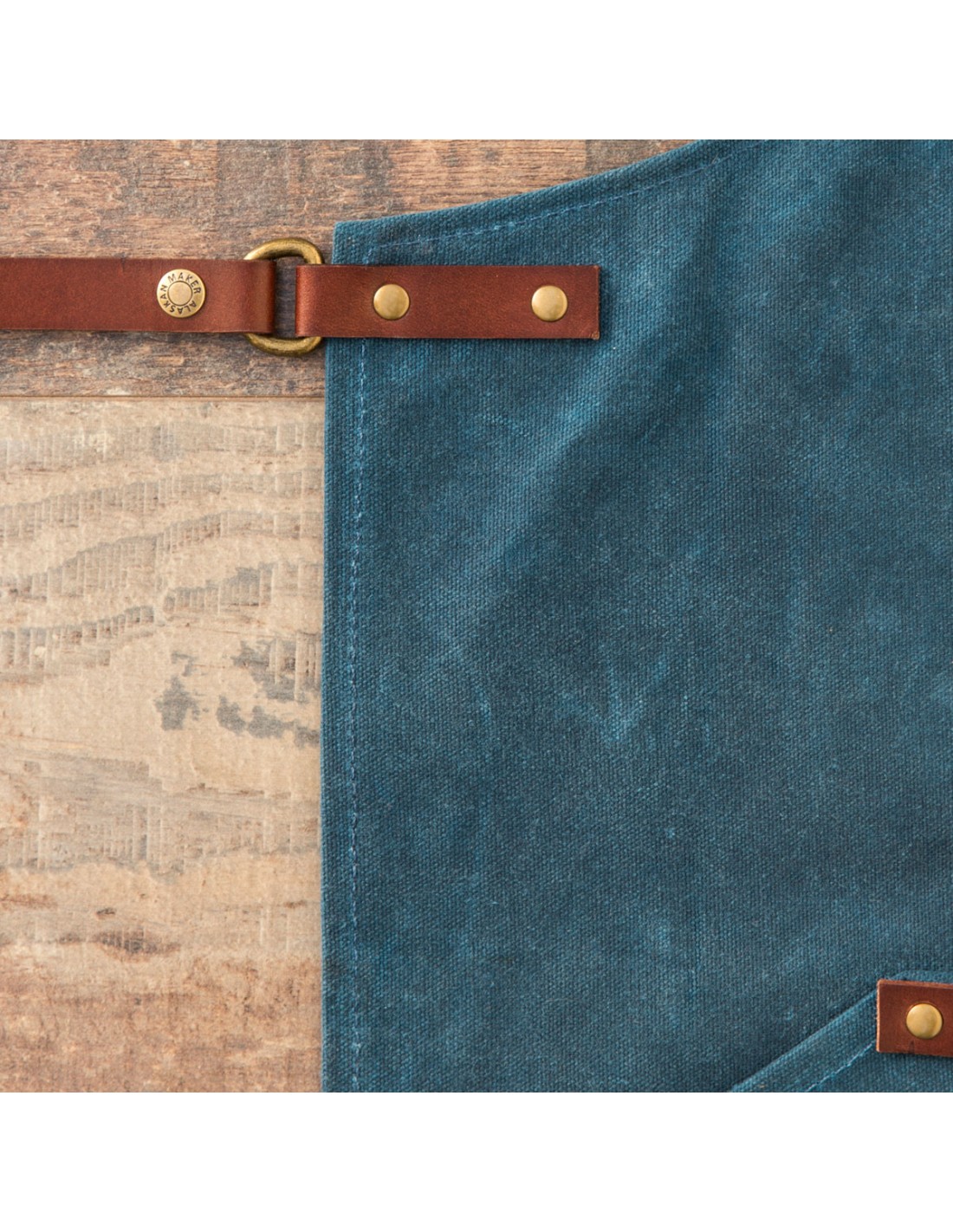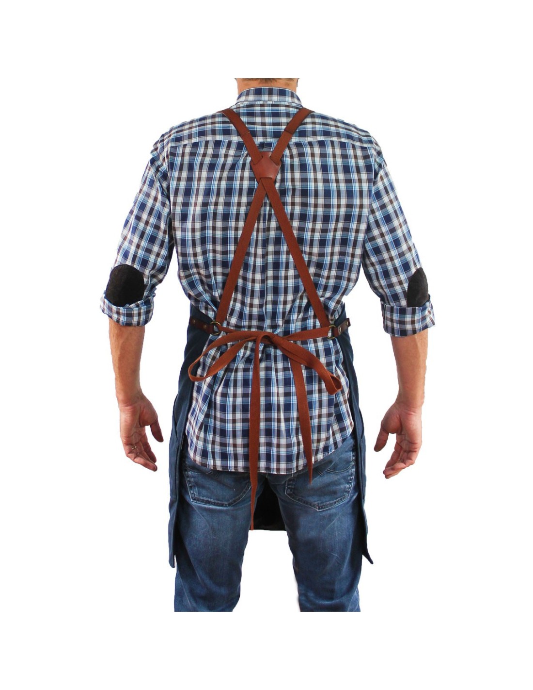 Les lanières dos croisées ajustables du tablier sont en cuir tannage végétal, pour plus de durabilité et de fonctionnalité.