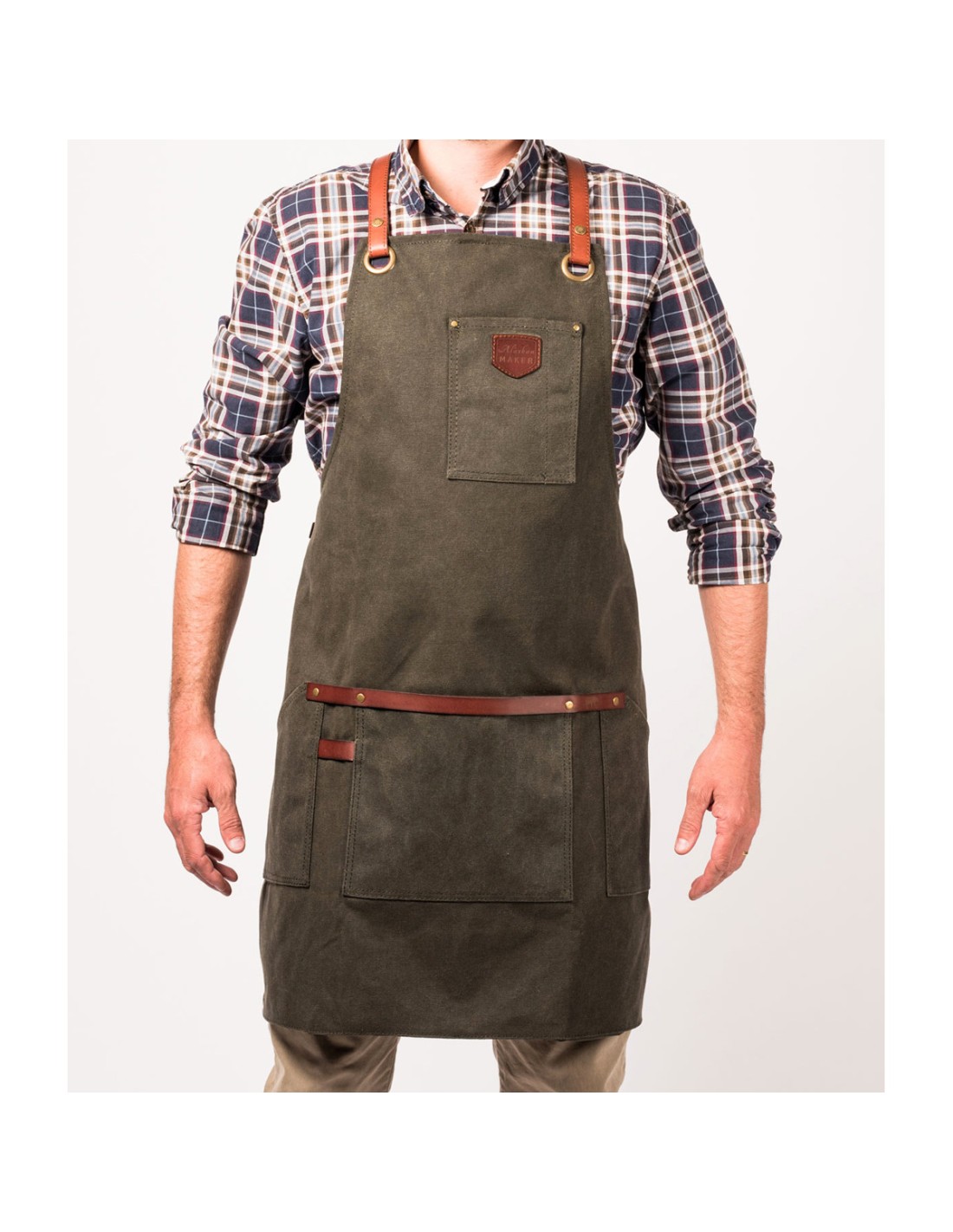 Le tablier No.547 porte élégamment la marque Alaskan Maker avec un logo en cuir sur la poitrine.