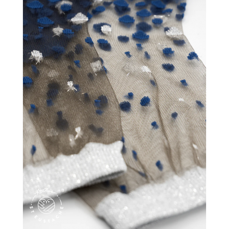 Nakameguro Denim. Dégradé de pois bleus et argentés sur un fond transparent : le classique plumetis revisité avec une touche de luminosité. Idéal les jeans et les baskets ! Inspiré de l'envolée des pétales de cerisier sur le canal de Nakameguro.