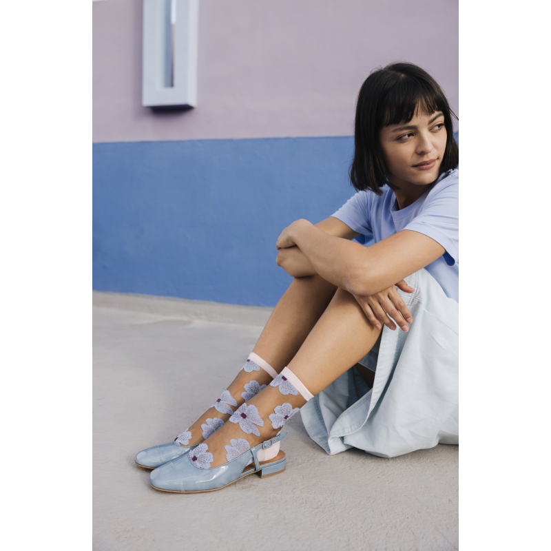 Chaussettes imaginées en France, fabriquées en Italie Nakameguro Denim. Dégradé de pois bleus et argentés sur un fond transparent : le classique plumetis revisité avec une touche de luminosité. Idéal les jeans et les baskets ! Inspiré de l'envolée des pétales de cerisier sur le canal de Nakameguro.