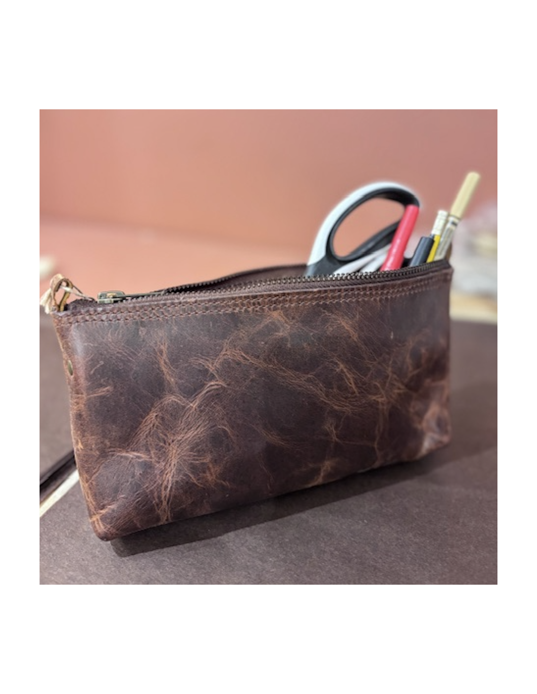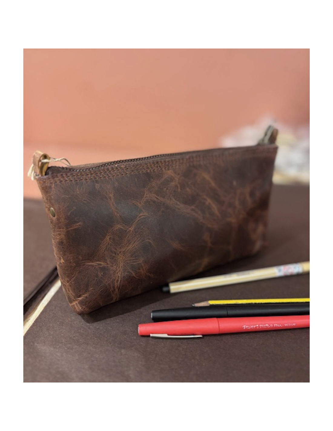 Cuir véritable, fermeture à glissière en métal. Fait à la main en Inde. A l'atelier, au bureau et ailleurs, cette trousse en cuir véritable met ses dimensions généreuses et sa robustesse à votre service. Simple, directe et sans fioriture, elle a l'évidence des choses faites pour durer.