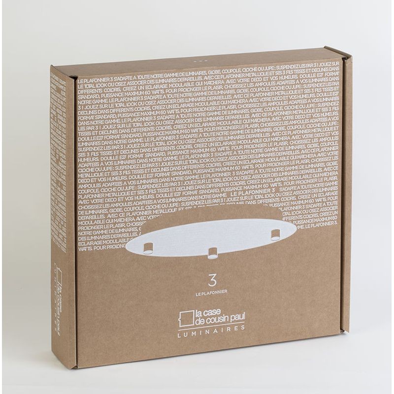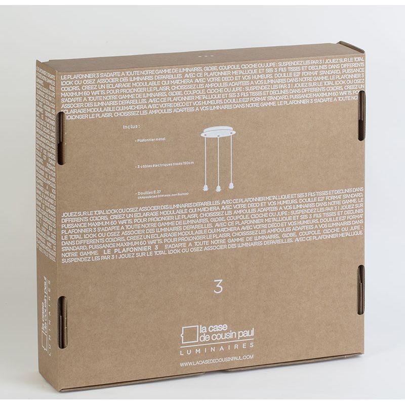 3 câbles en fil tissé 80 cm, 100 cm et 120 cm longueurs réglables 1 pavillon metal mat avec serre-câbles et micro vis d'arrêt Pavillon en acier désigné et fabriqué par La case de cousin paul 3 douilles E 27 (max 250 V, 4 A, certifié CE-EN60238), max 60 W