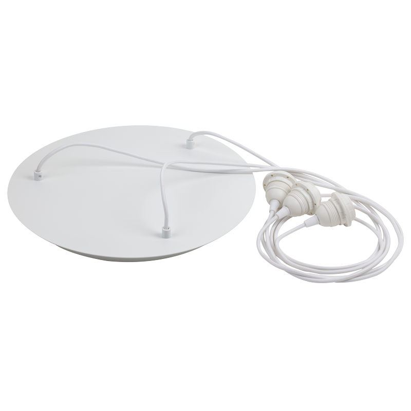 1 cable en plastique blanc de 60 cm 1 pavillon blanc polypropylène avec bague et vis d'arrêt 1 douille E 27 Ampoule non fournie.