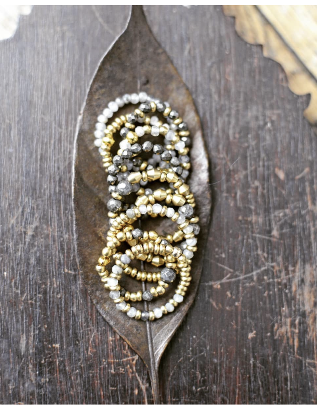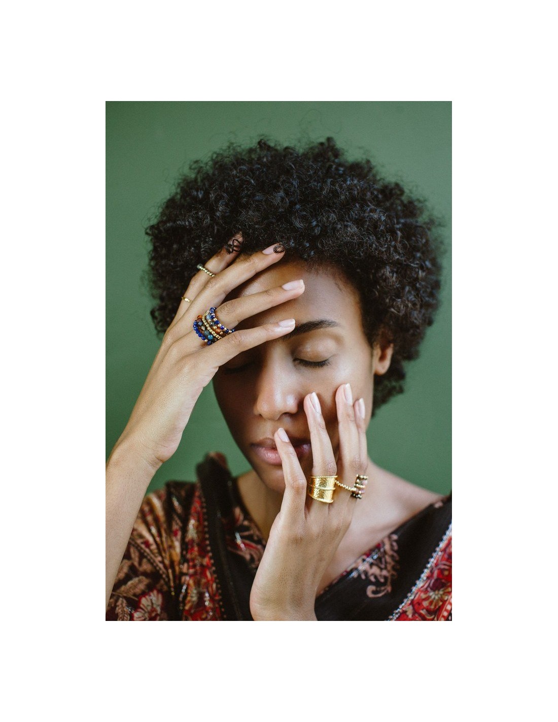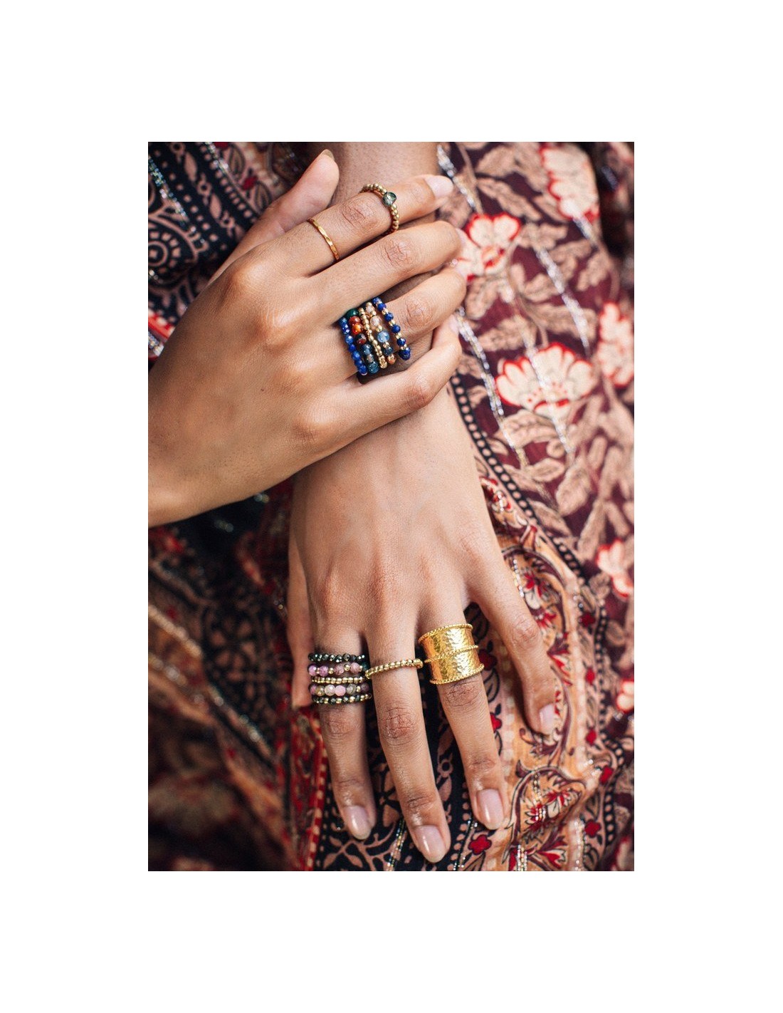 La collection Antik se pare d’un nouveau souffle. Cette saison, les pierres de tourmaline et d’agate tigrées sont réchauffées par les perles en laiton et les quartz de l’Himalaya.
