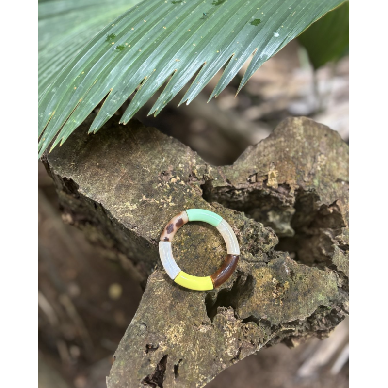 Bracelet en perles colorées séparées par des noeuds tissés. Perles bois et africaines