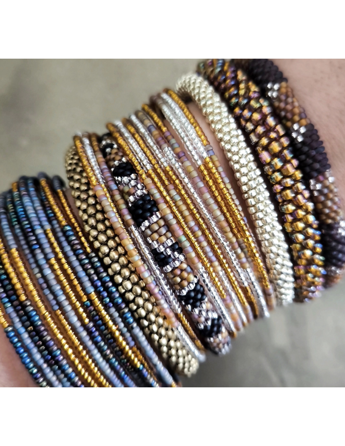 Réalisés entièrement en perles Miyuki (perle japonaise de haute régularité), les bracelets Cosmos se démarqueront par leur brillance et aspect poli. On les aime pour réhausser les couleurs des autres collections, ils se marient parfaitement avec les Pital pour un mélange argent et laiton.