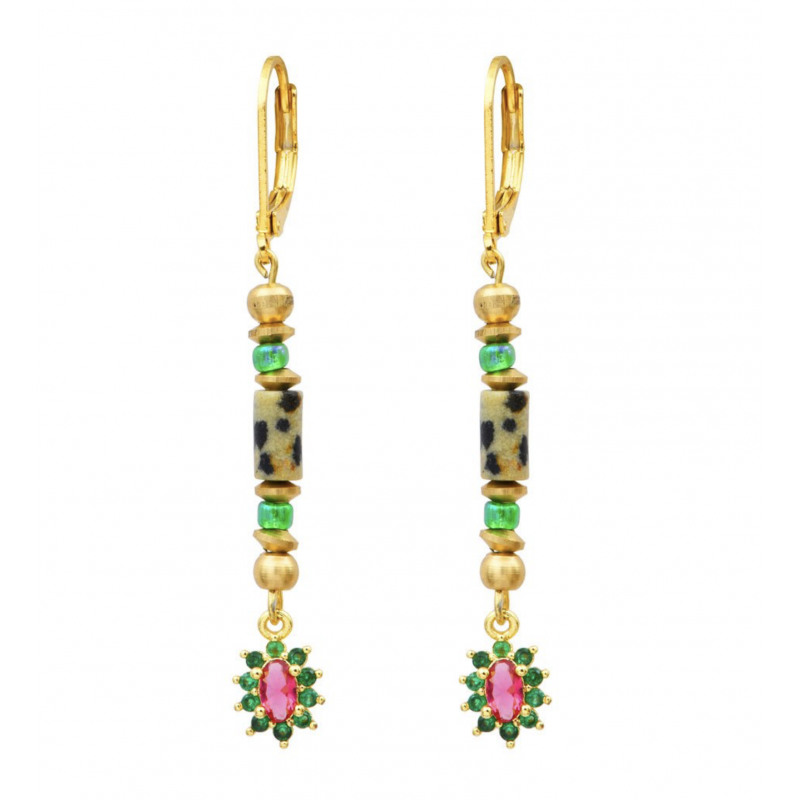 Boucles d'oreilles uniques, réalisées à la main dans un petit atelier montpelliérain. Pierres semi-précieuses, breloques et chaînes finition plaquée or 3 microns.