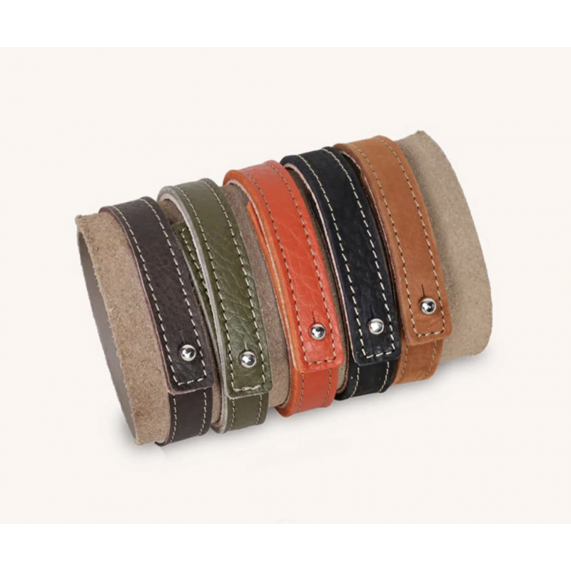 Ce bracelet est fabriqué à partir de cuir ressourcé et doublé d’un cuir au tannage végétal hypoallergénique, idéal pour les peaux sensibles. Il se ferme avec un bouton de col argenté sans nickel, pensé pour un port confortable et sans allergie. Son design simple, agrémenté d’une piqûre en point sellier, le rend aussi élégant que polyvalent. Grâce à ses quatre positions de réglage, il s’adapte facilement à différents poignets. Léger et pratique, il se porte seul ou en accumulation.