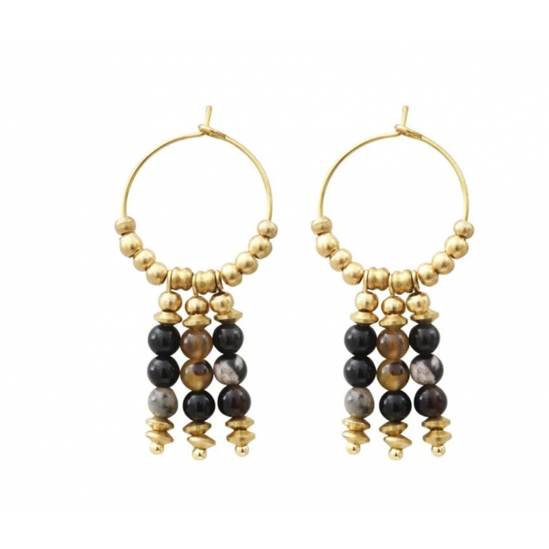 Boucles d'oreilles uniques, réalisées à la main dans un petit atelier montpelliérain. Pierres semi-précieuses, breloques et chaînes finition plaquée or 3 microns.