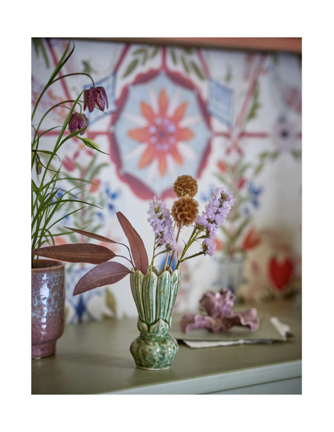 Le Vase Cyrill de Creative Collection est fabriqué en grès avec une glaçure verte et une expression galbée.