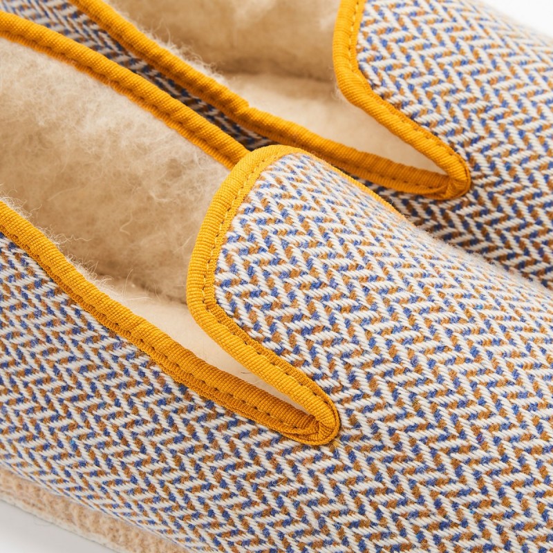 Une Pantoufle à Pépère traditionnelle, dans un élégant tissu pied de poule. Un modèle que les Anglais nous envient... La Pantoufle à Pépère est intégralement fabriquée en France en Charente