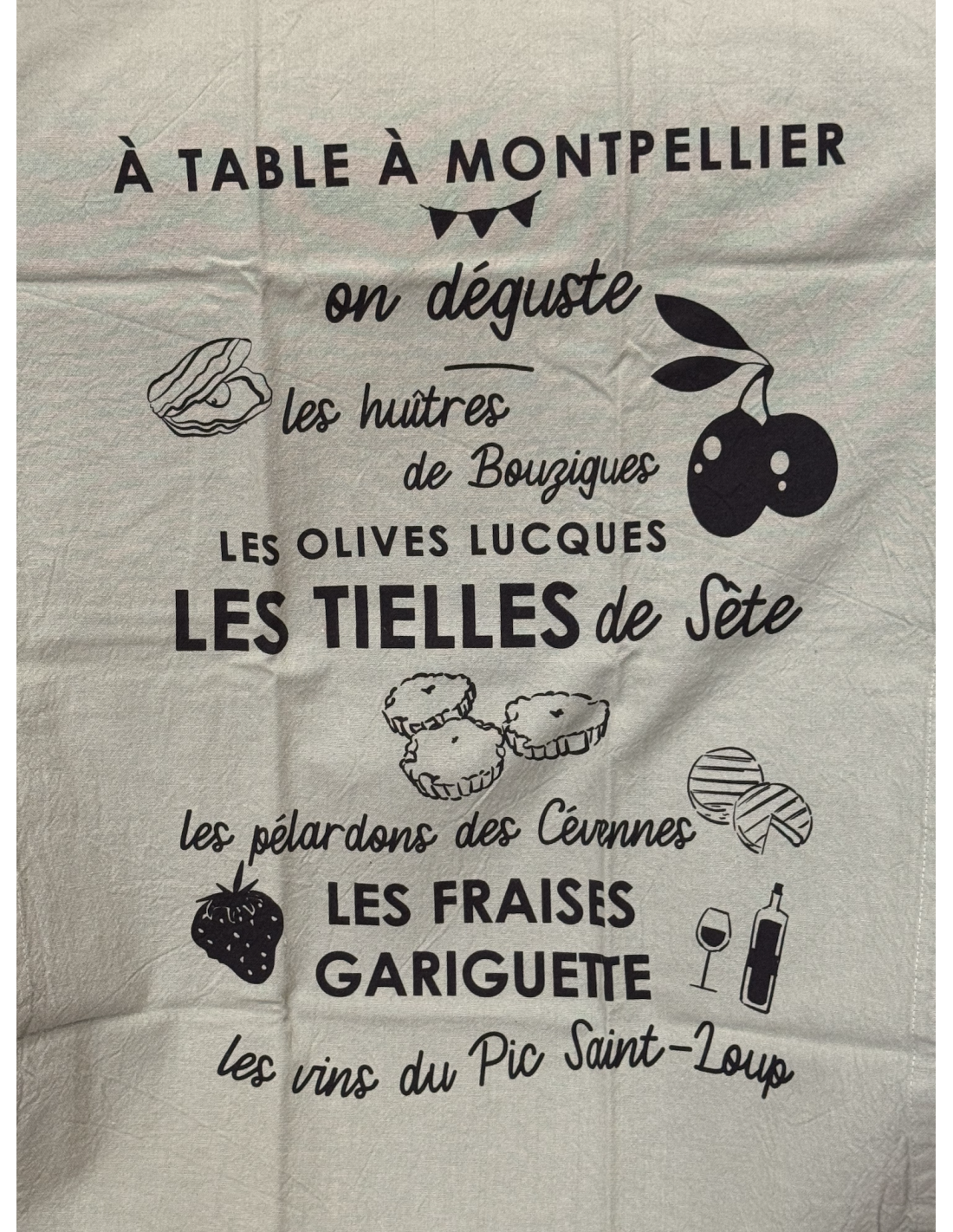 On déguste, les huitres de Bouzigues, les olives Lucques, les tielles de Sète, les pélardons des Cévennes, Les fraises gariguettes, les vins du Pic Saint-Loup"