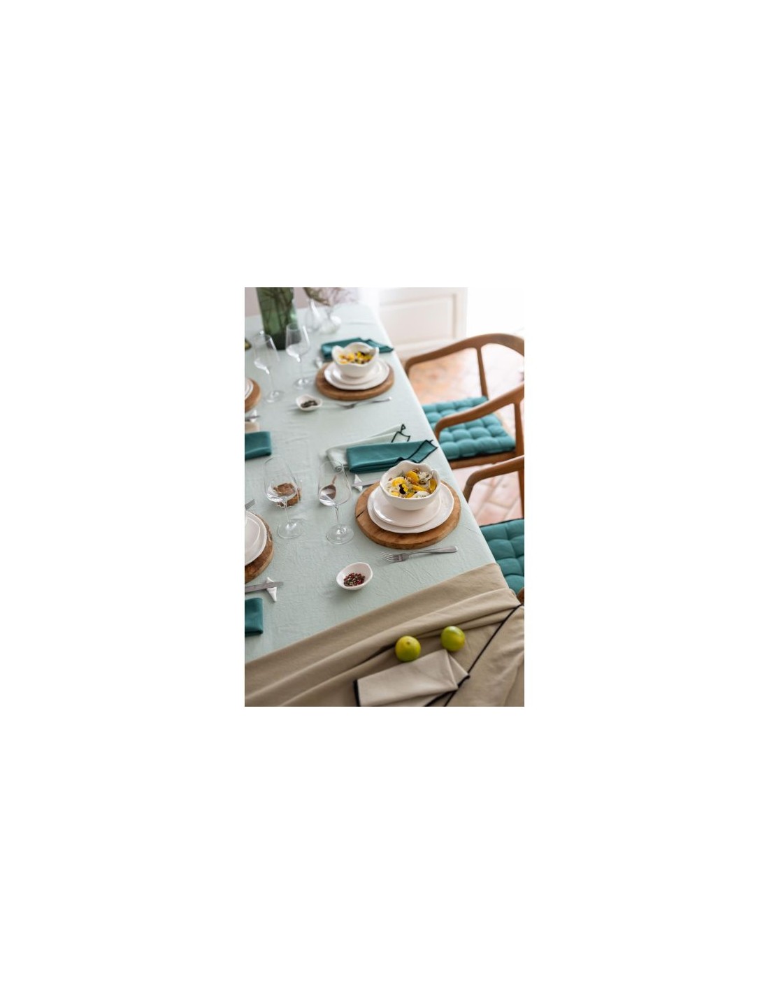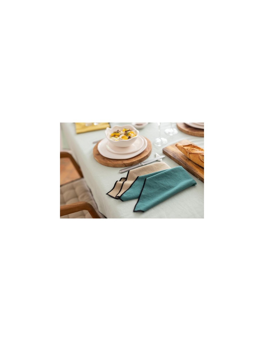Avec sa finition bourdon contrastant pour un maximum d'élégance, son coton recyclé et lavé pour plus de douceur et de respect de l'environnement elle sera indispensable pour recevoir vos convives dans une ambiance chic et festive avec une note écologique.