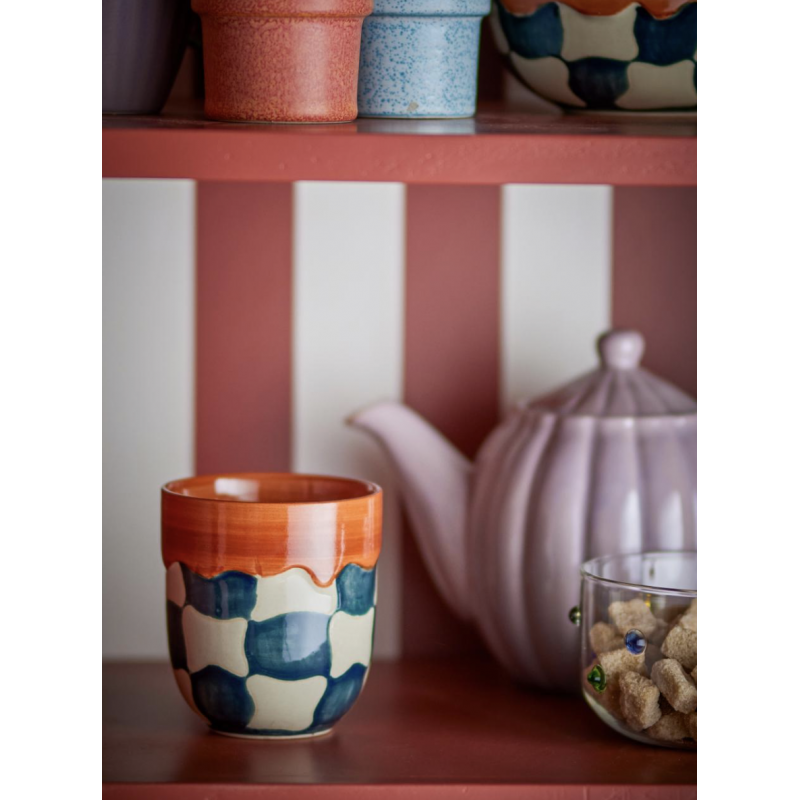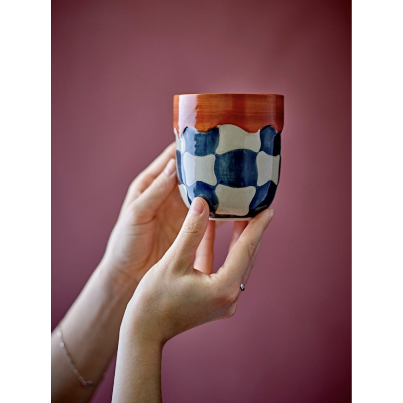 La tasse Check de Bloomingville en grès, sont peintes à la main avec un motif graphique en damier dans des tons bleus et clairs et ont un bord chaud et rougeâtre sur le dessus.