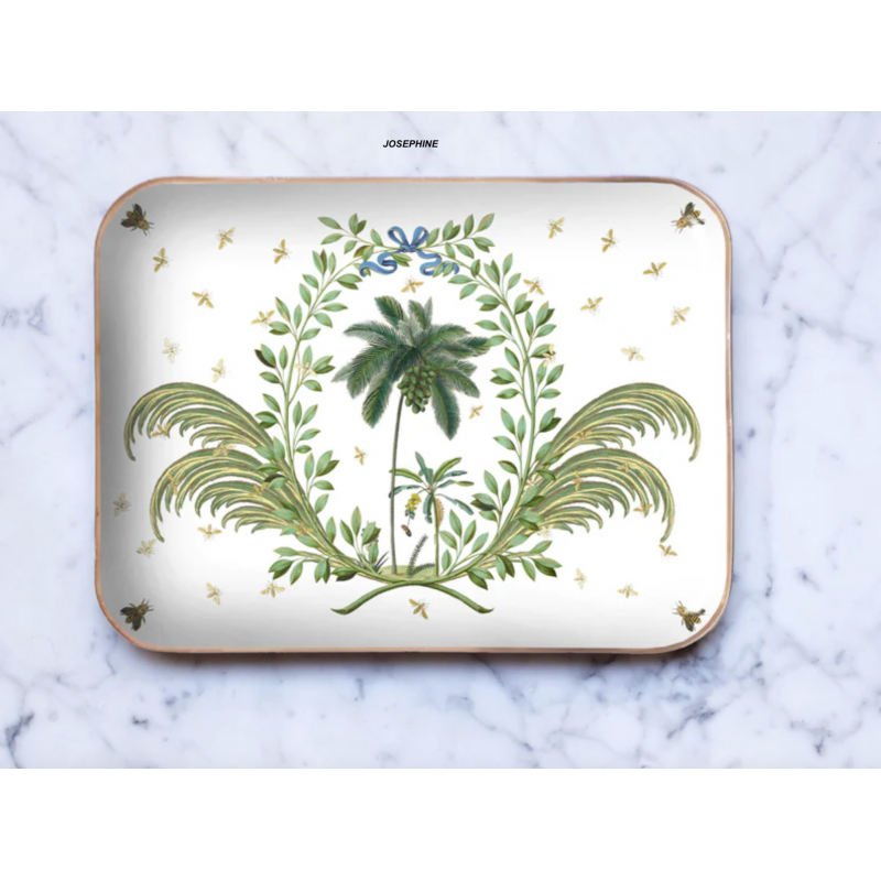Plateau rectangulaire de haute qualité en métal émaillé, à l'aspect brillant, finition bordure dorée peint à la main. Verso couleur blanche.