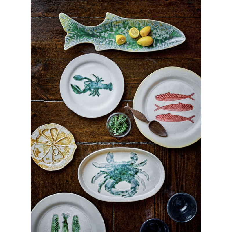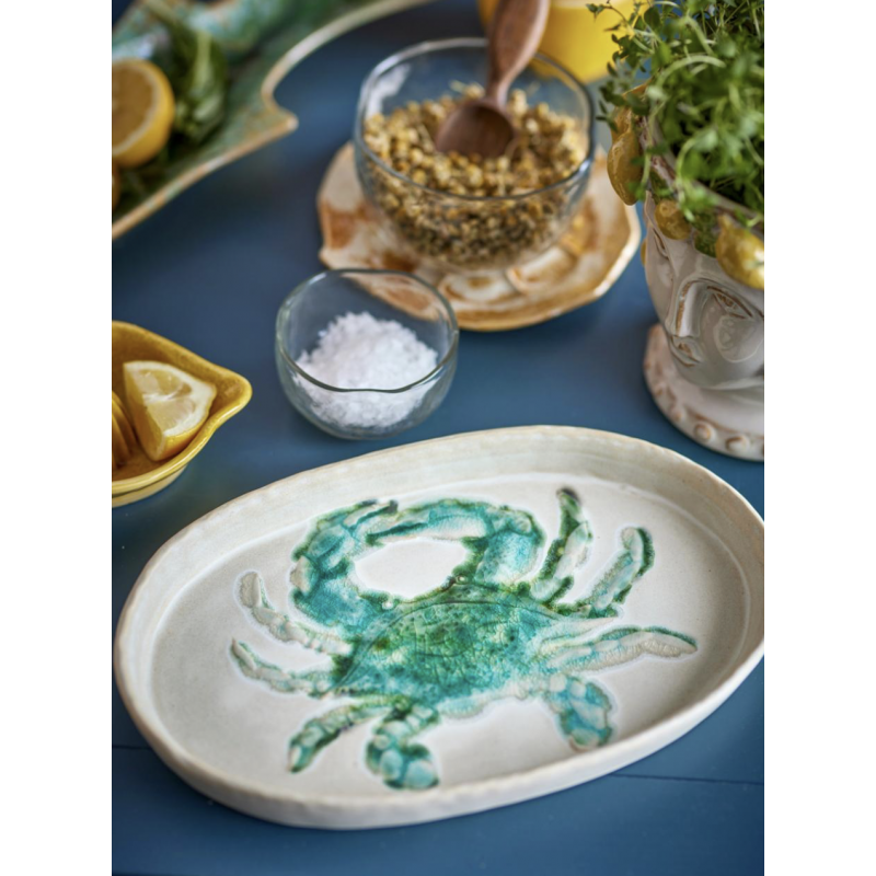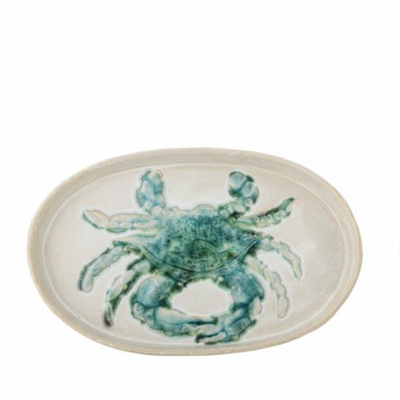 L’assiette est en céramique est ornée d’un motif émaillé représentant un crabe vert au centre.