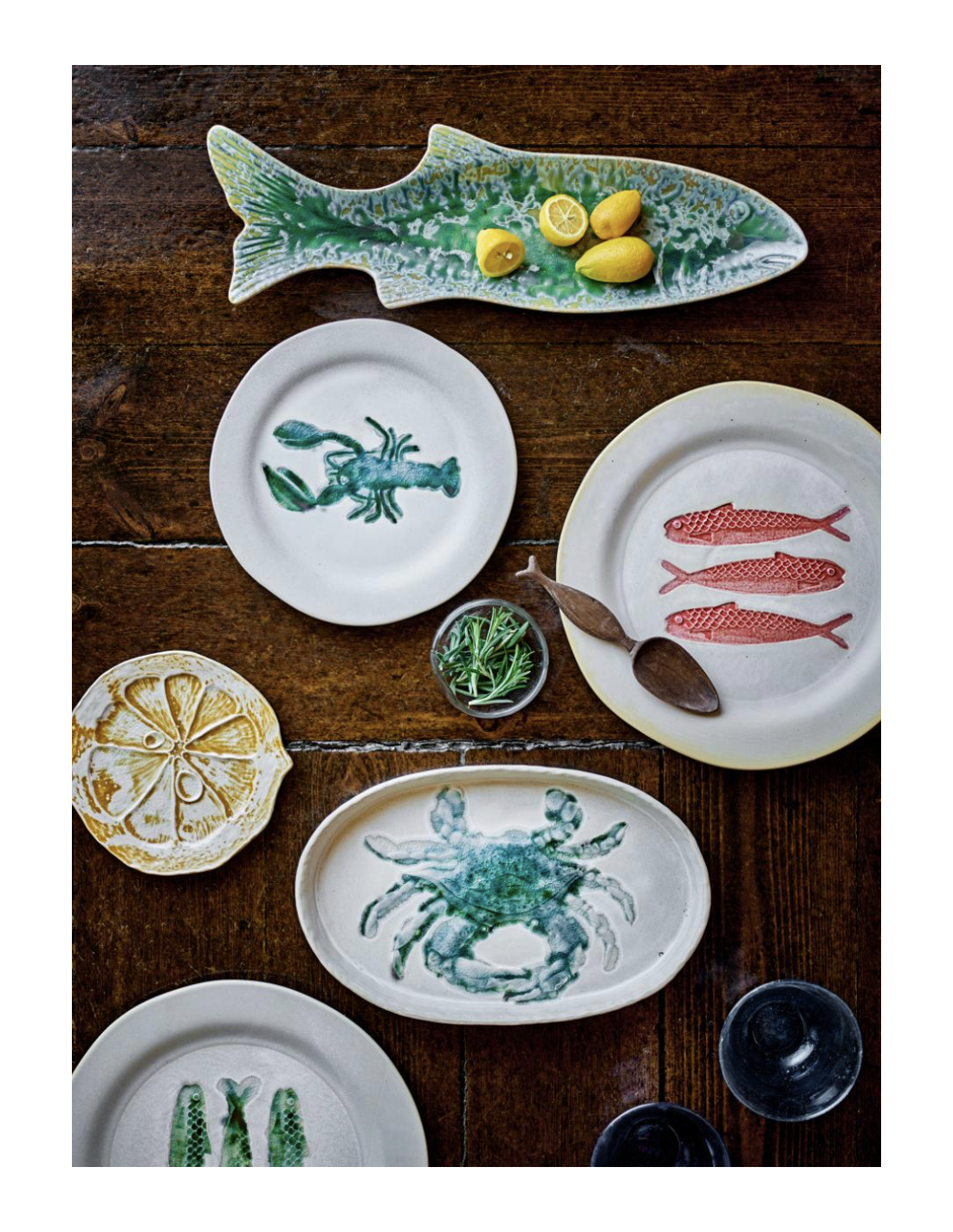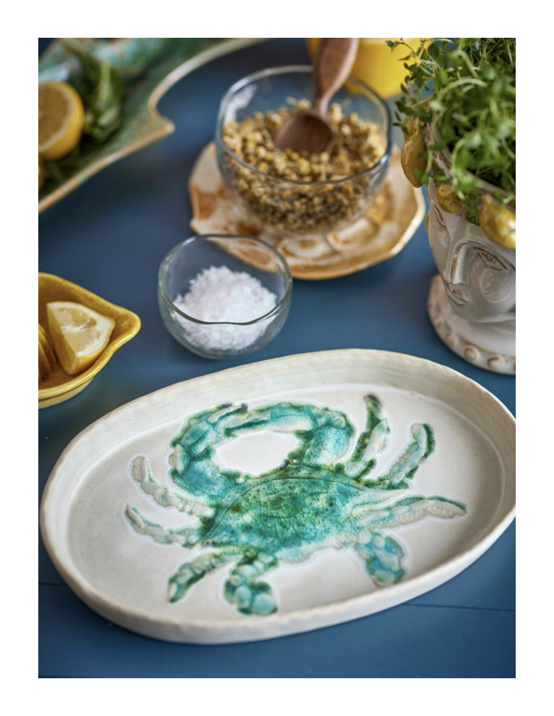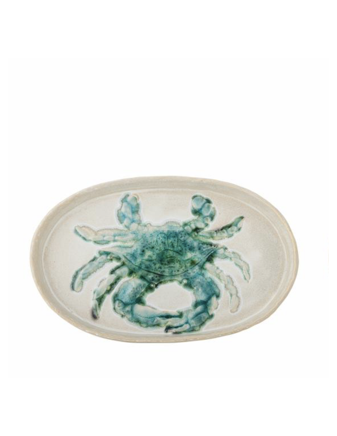 L’assiette est en céramique est ornée d’un motif émaillé représentant un crabe vert au centre. La décoration brillante contraste avec la surface mate, créant une expression à la fois ludique et décorative. Les variations de glaçure rendent chaque pièce unique.