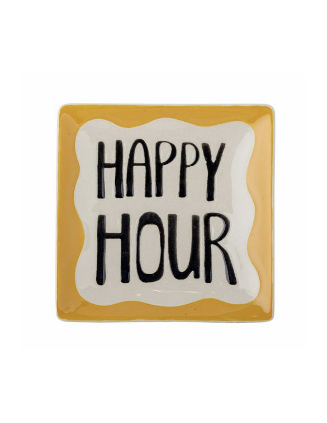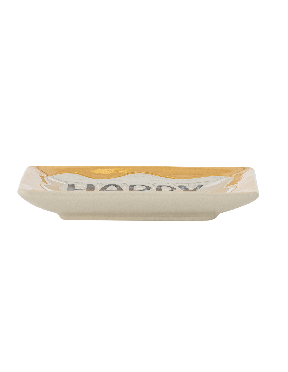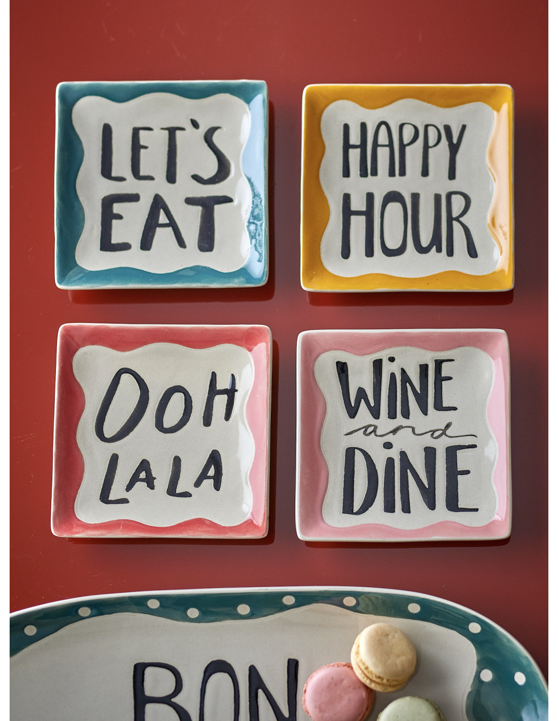 L’Assiette Soline de Bloomingville, carrées en grès, avec au centre une zone crème et une inscription manuscrite.