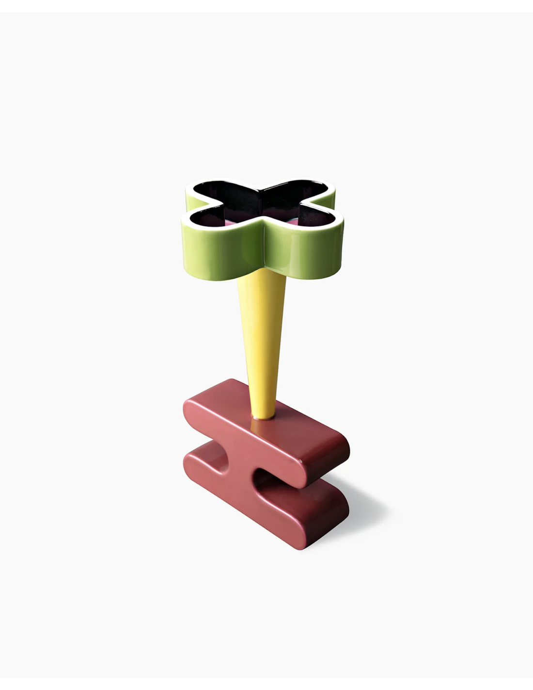 Dans une alternance de Pantoni inédits, du fuchsia au vert pistache, du jaune canari à l'argent, les éléments se succèdent pour composer des formes symboliques, chacun recouvert d'émaux brillants, certains avec des décalcomanies.