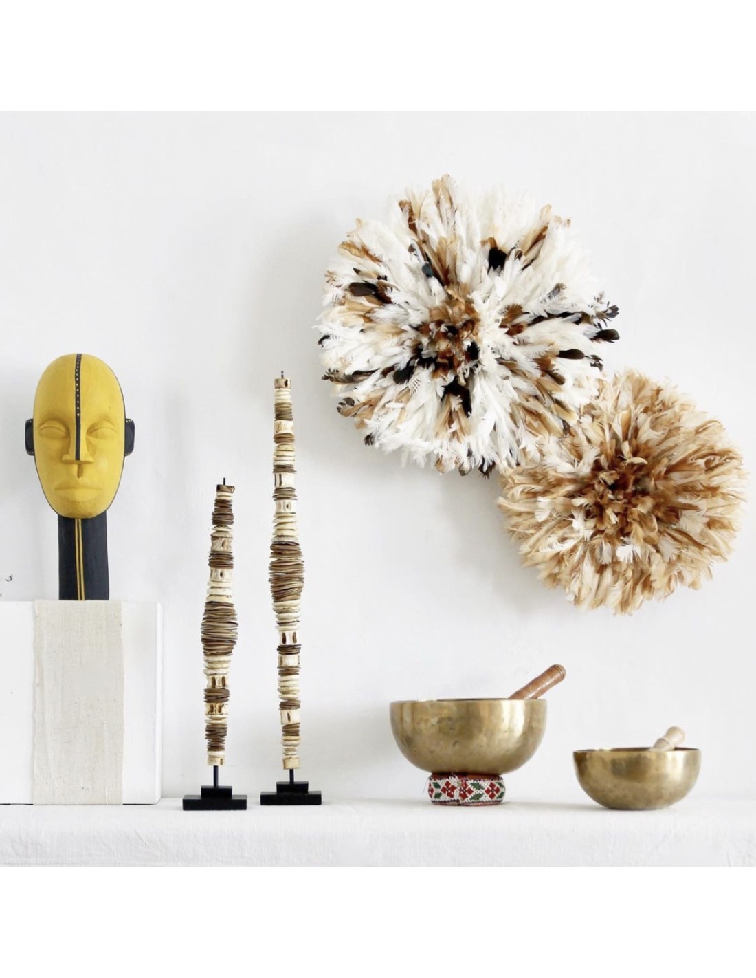 Le chapeau juju, une coiffe traditionnelle en plumes qui constitue une décoration murale étonnante et accrocheuse, seule ou associée à d'autres tailles et/ou couleurs