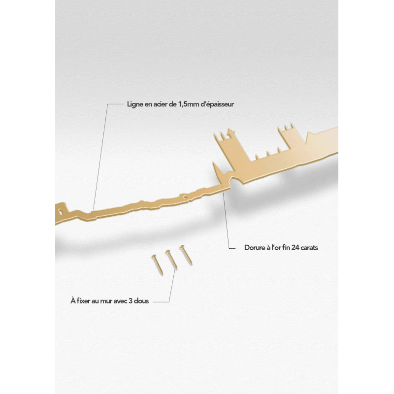 Ligne en acier de 1,5 mm d’épaisseur A fixer au mur avec 3 clous En extérieur comme en intérieur Pas adapté pour les murs en brique ou en béton