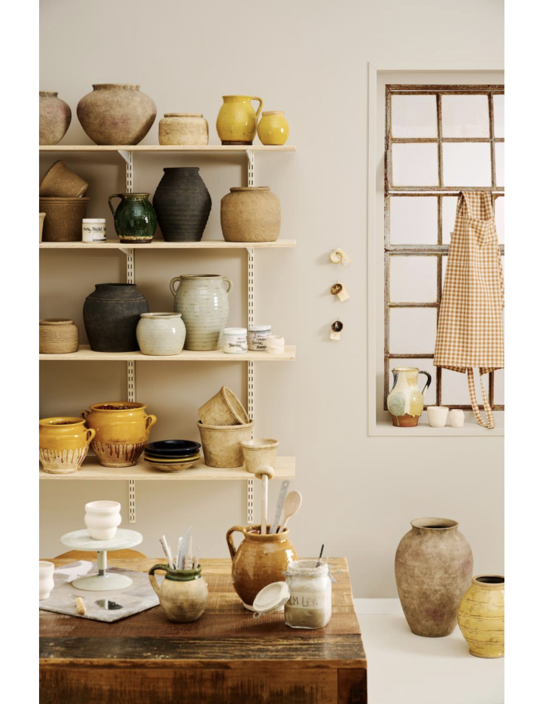 La forme ronde et pleine est tournée à la main, et la surface est peinte à la main en 6 à 7 couches, ce qui crée un subtil jeu de couleurs avec des nuances gris foncé et marron qui soulignent la texture naturelle du matériau.