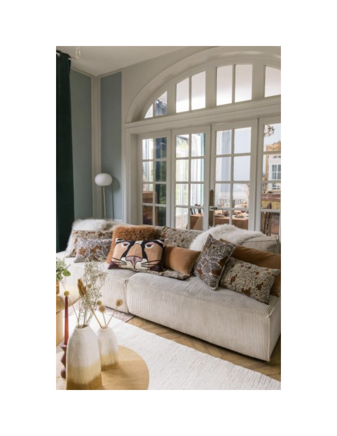 Une très belle combinaison d'une face velours de coton aux coloris chatoyants et d'une face en chambray de coton de coloris lin donne à la ligne Elise sa signature particulière.