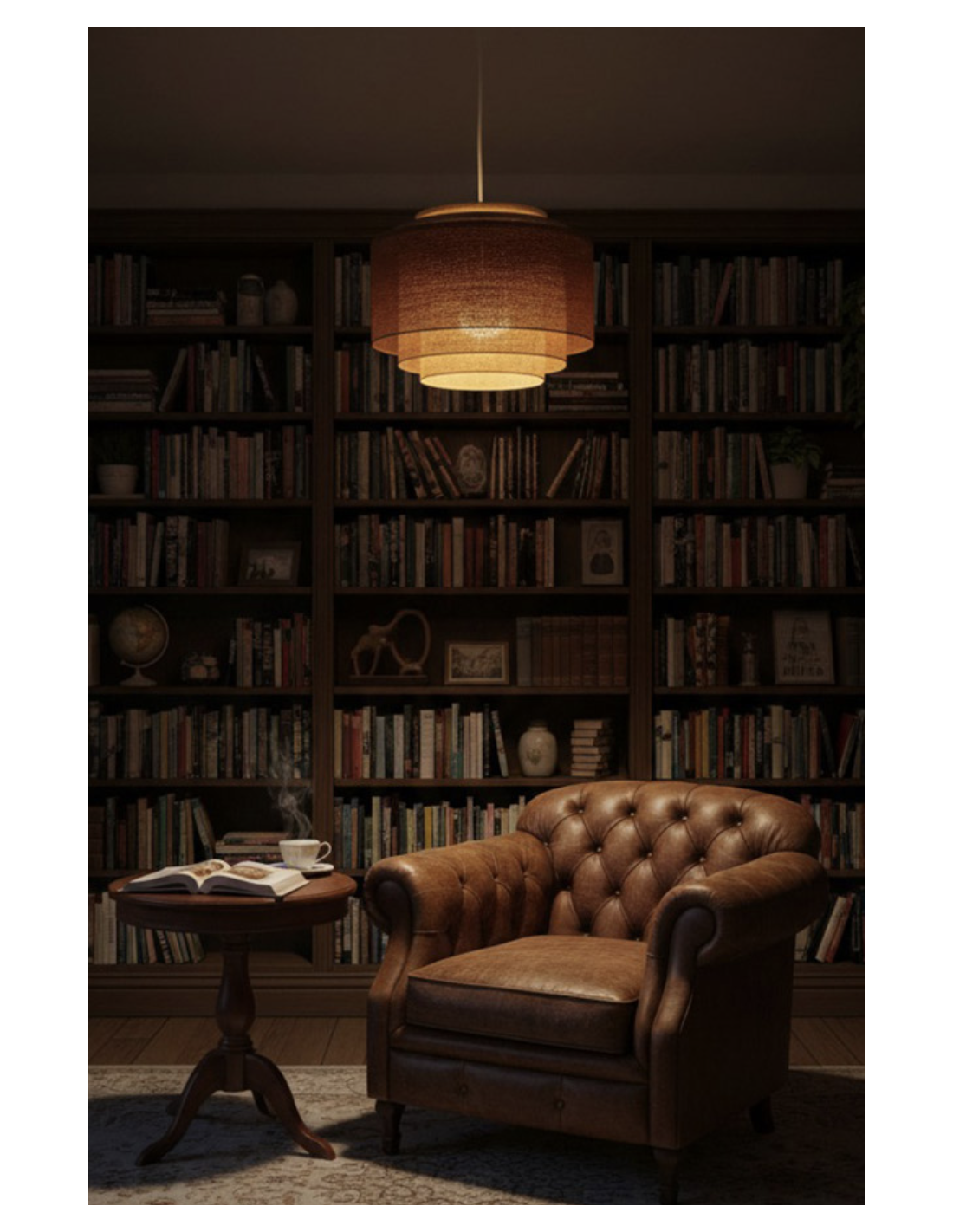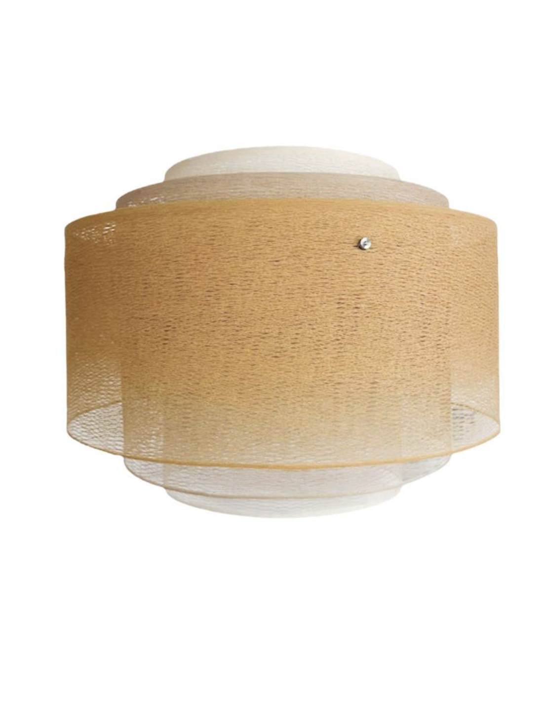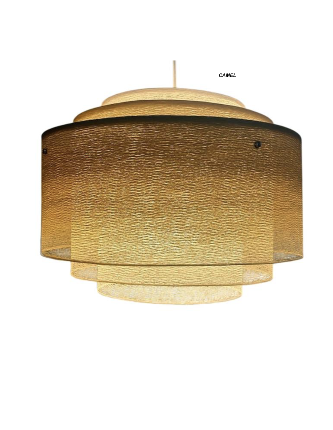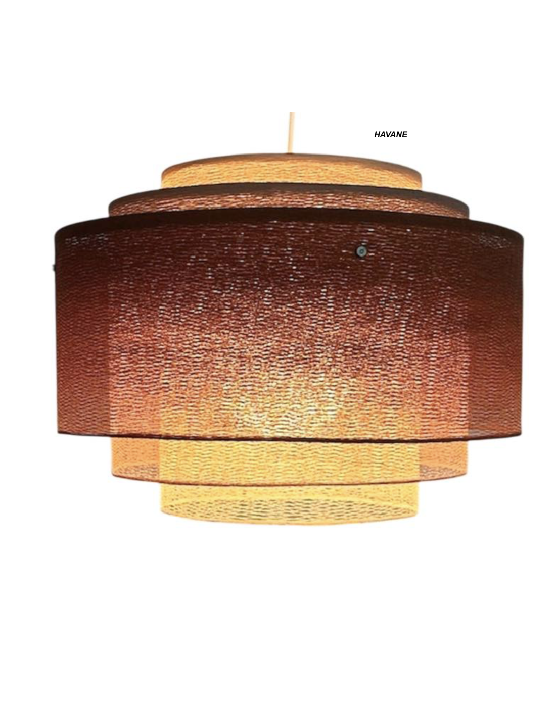 Les cylindres superposés qui composent sa structure apportent du relief et un effet visuel unique, tandis que la transparence des fils diffuse une lumière douce et chaleureuse.