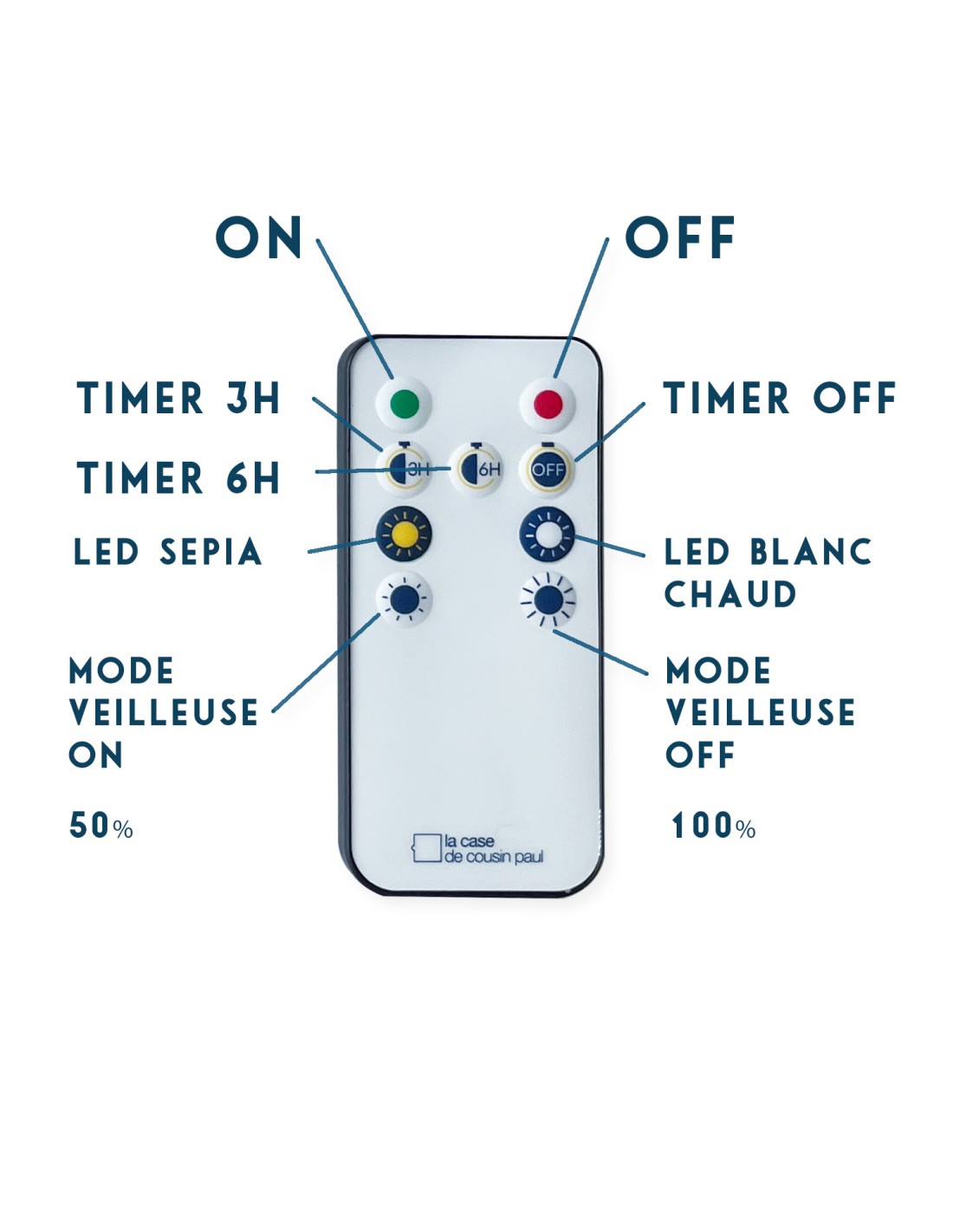 Avec sa télécommande vous pourrez l'allumer et l'éteindre à distance mais aussi choisir la chaleur de son éclairage (sépia pour un effet poétique et délicatement chaleureux ou blanc chaud pour une restitution parfaire des couleurs !). Elle offre également 2 intensités lumineuses qui permettent en un clic sur la télécommande de réduire de moitié l'éclairage pour diffuser une délicate ambinace lunmineuse.