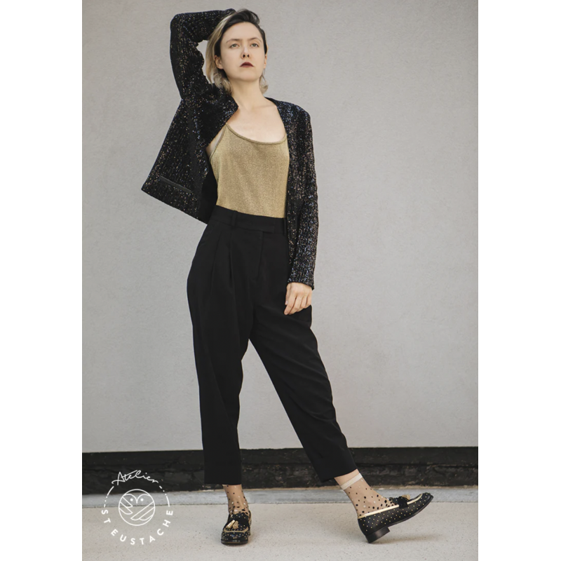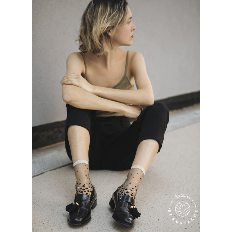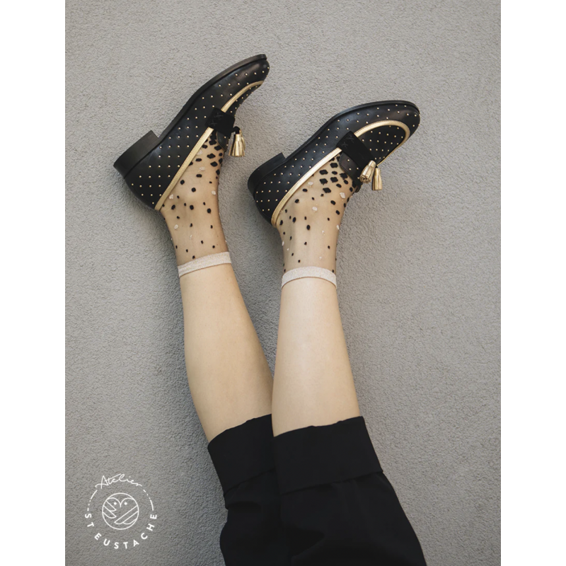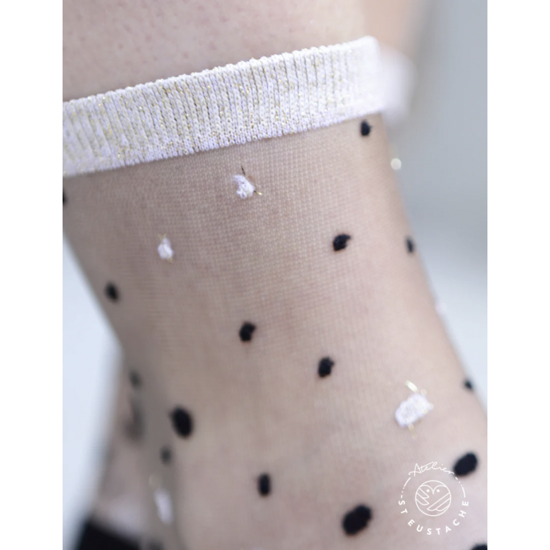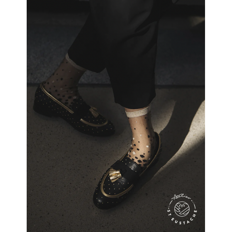 Chaussettes imaginées en France, fabriquées en Italie Graphique et structuré, ce modèle s'inspire de la tenue de l'emblématique personnage de Commedia Dell'Arte Arlequin. Le modèle noir est rehaussé de fins pois dorés. À porter avec une pantalon noir et des escarpins ou des mocassins. Parfait pour les tenues de fêtes.