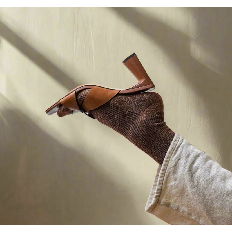 Chaussettes imaginées en France, fabriquées en Italie Sa teinte chaude et cuivrée apportera une touche sophistiquée et audacieuse à vos tenues. Une paire inspirée des formes géométriques des épines de sapin à porter avec un pantalon beige et une touche de rappel marron.