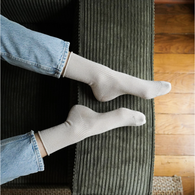 Chaussettes imaginées en France, fabriquées en Italie Un subtil éclat irisé aux douces couleurs qui apportera une touche de glamour à vos tenues. Une paire inspirée des formes géométriques des épines de sapin à porter avec un jean brut.