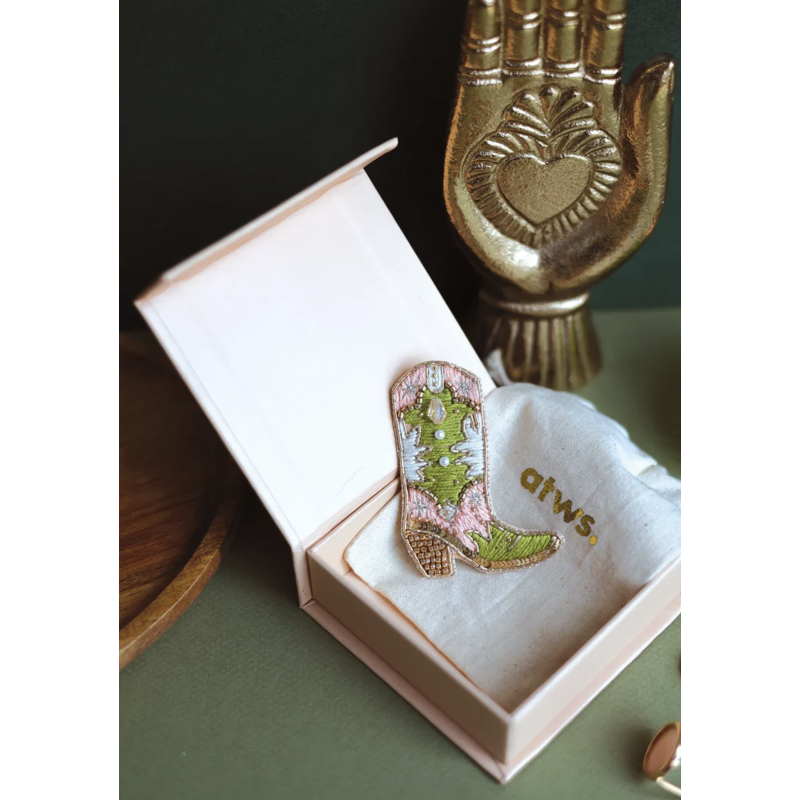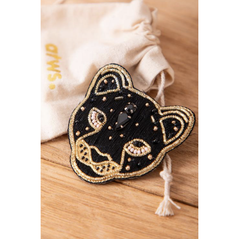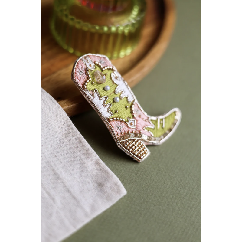 Ces jolies broches précieuses sont dessinées et brodées à la main avec amour, mêlant perles, strass et fil de cannetille doré.