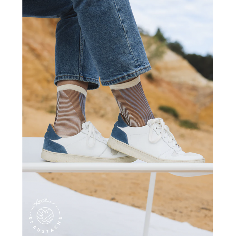 Chaussettes imaginées en France, fabriquées en Italie Les chaussettes transparentes Shibuya Caramel se porteront avec tout : mocassins, derbies ou classiques baskets blanches. Leurs paillettes dorées illumineront vos tenues préférées. Modèle inspiré du grand passage piéton de Shibuya à Tokyo.