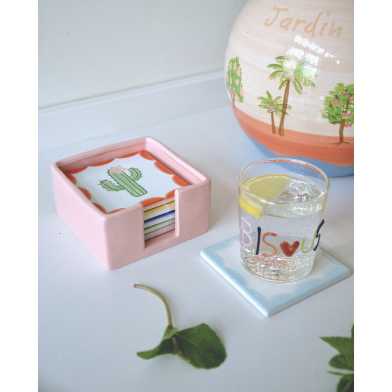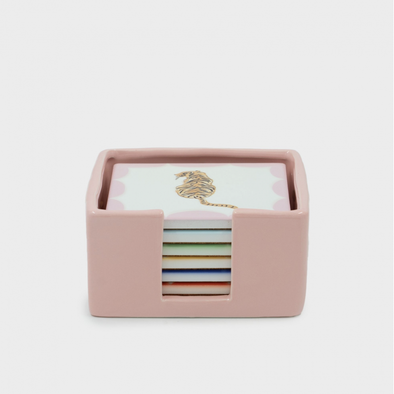Les sous-verres colorés sont rangés dans un support rose avec une finition émaillée, qui attirera tous les regards sur votre table ou votre comptoir. Non seulement ils sont beaux à regarder, mais ils sont également pratiques.