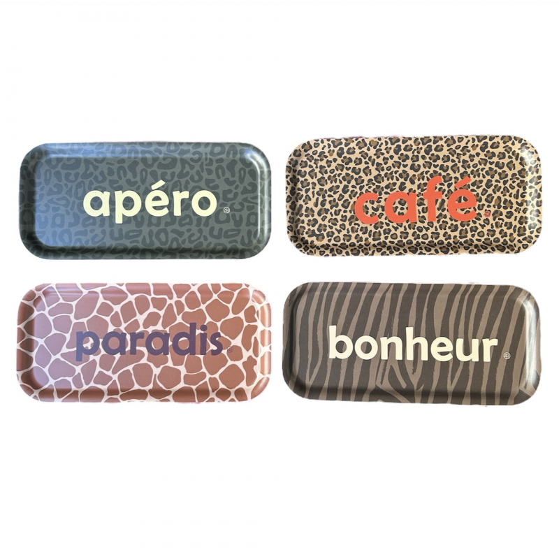 Plateau rectangulaire de haute qualité en métal émaillé, à l'aspect brillant, finition bordure dorée peint à la main. Verso couleur blanche. Format 20x27 cm